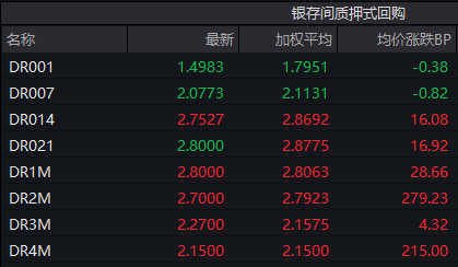 银银间市场回购定盘利率方面,FDR001报1.7800%,较上日上涨2个基点;FDR007报2.0900%,较上日下跌6个基点;FDR014报2.8500%,较上日上涨20个基点。而银行间市场回购定盘利率方面,FR001报1.7900%,较上日下跌6个基点;FR007报2.5000%,较上日上涨20个基点;FR014则报4.1000%,较上日大幅上涨110个基点。