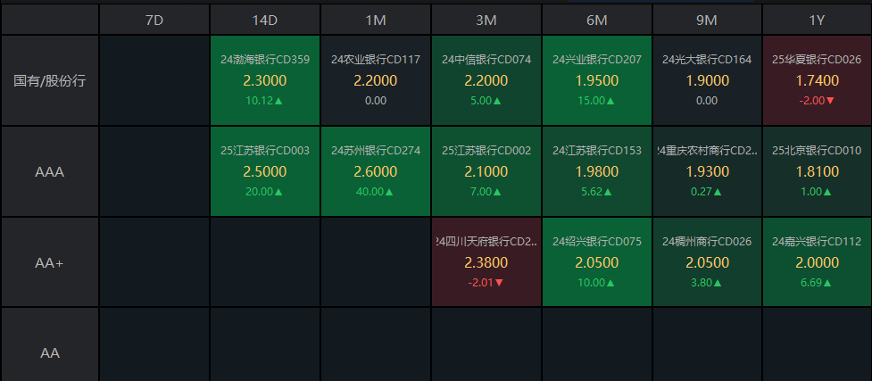 在存单市场方面,今日3个月期国股存单的需求较为旺盛,利率位于2.0%-2.5%之间,较前一日上行5个基点;而1年期国股存单则报在1.72%-1.89%的位置,较前一日下行2个基点。AAA级存单方面,9个月期成交利率为1.93%,1年期成交利率为1.81%。