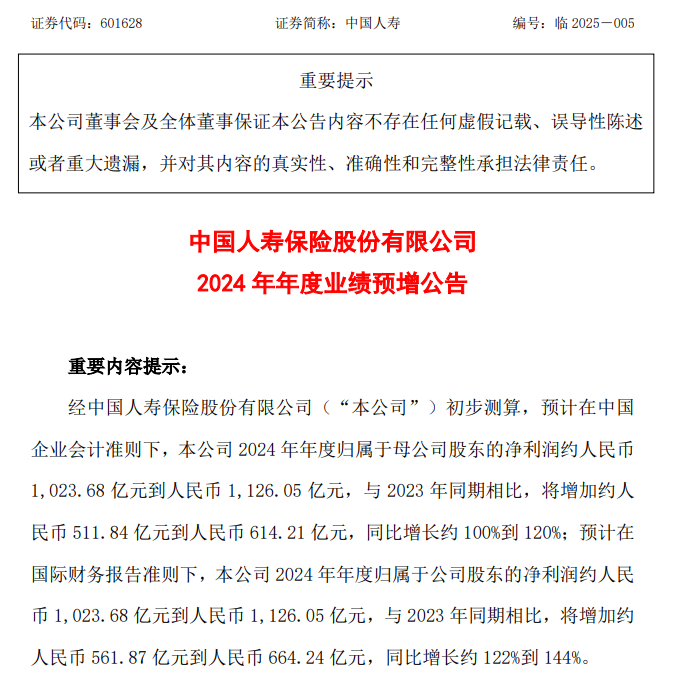 中国人寿发布公告,预计2024年全年归属于母公司股东的净利润将达到人民币1023.68亿元至1126.05亿元,同比增长约100%到120%,扣除非经常性损益后净利润同样实现大幅增长。