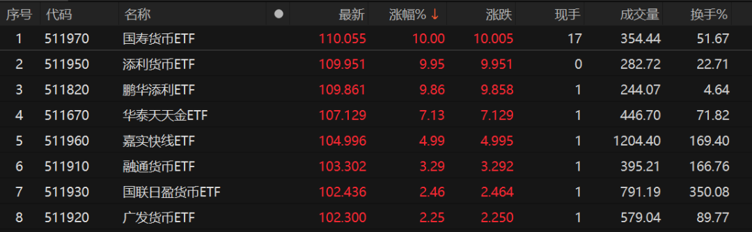 当日午后,金融市场风云突变,多只场内货币基金突然启动拉升行情。国寿货币ETF率先发力,午后开盘后迅速上扬,短短不到10分钟内便强势触及涨停板。截至收盘,国寿货币ETF以10%的涨幅傲视群雄。