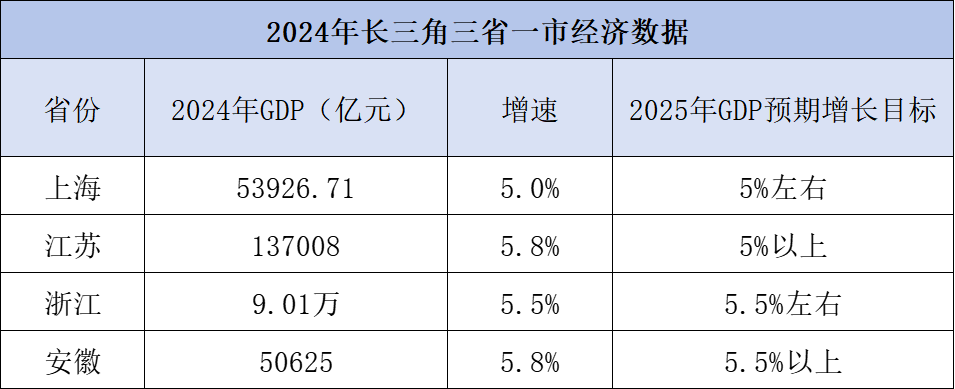 在经济增长速度方面,三省一市均展现出强劲动力,增速均不低于全国平均水平的5.0%。具体而言,江苏与安徽均以5.8%的增速领跑,浙江以5.5%紧随其后,上海则以5%的增速稳步增长。展望2025年,三省一市的GDP预期增长目标同样引人瞩目:上海设定在5%左右,江苏力求5%以上,浙江与安徽则均瞄准5.5%以上的增长。