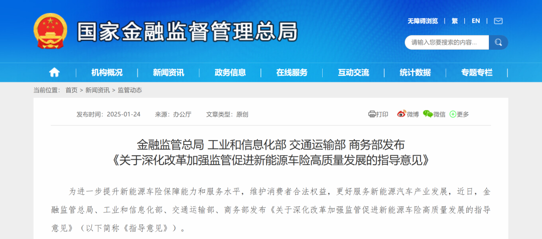 金融监管总局、工业和信息化部、交通运输部及商务部于1月24日联合发布《关于深化改革加强监管促进新能源车险高质量发展的指导意见》,旨在通过一系列政策举措,合理降低新能源汽车维修使用成本,建立高效赔付风险分担机制,并推动新能源车险的高质量发展。这些措施将有效满足民众的车险保障需求,更好地服务于新能源汽车产业的蓬勃发展。