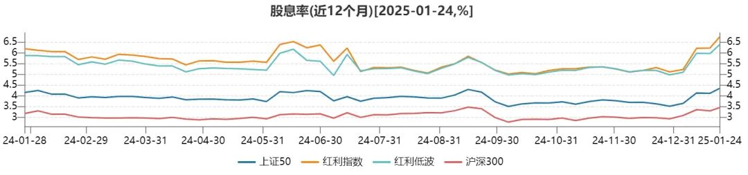 作为红利资产的核心要素,股息率一直是市场关注的焦点。数据显示,截至1月24日,近12个月以来,红利指数和红利低波指数的股息率分别为6.75%和6.39%,远高于主流宽基指数。业内人士分析称,随着春节临近,红利相关指数成分股迎来派息高峰,从而推动了相关指数股息率的提升。