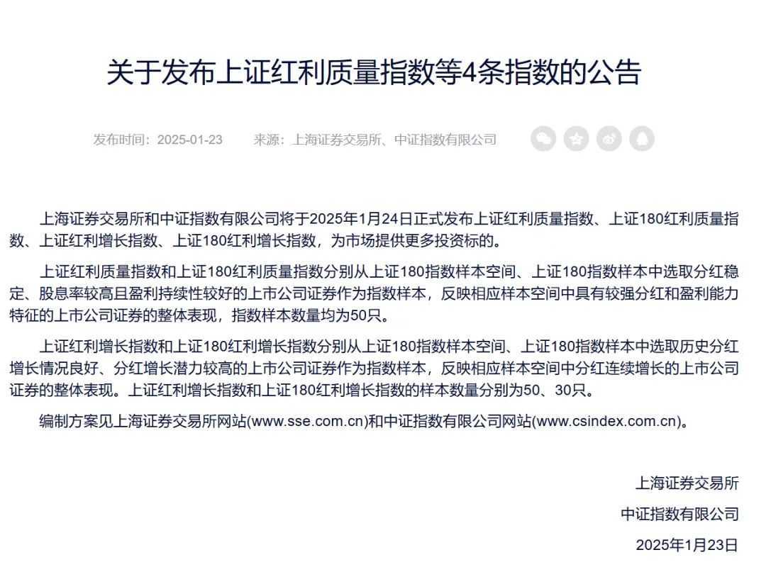 2025年1月24日,上海证券交易所携手中证指数有限公司,正式推出了四条全新的红利指数:上证红利质量指数、上证180红利质量指数、上证红利增长指数以及上证180红利增长指数。此举旨在进一步扩充红利指数体系,为投资者提供更为丰富的投资选择。