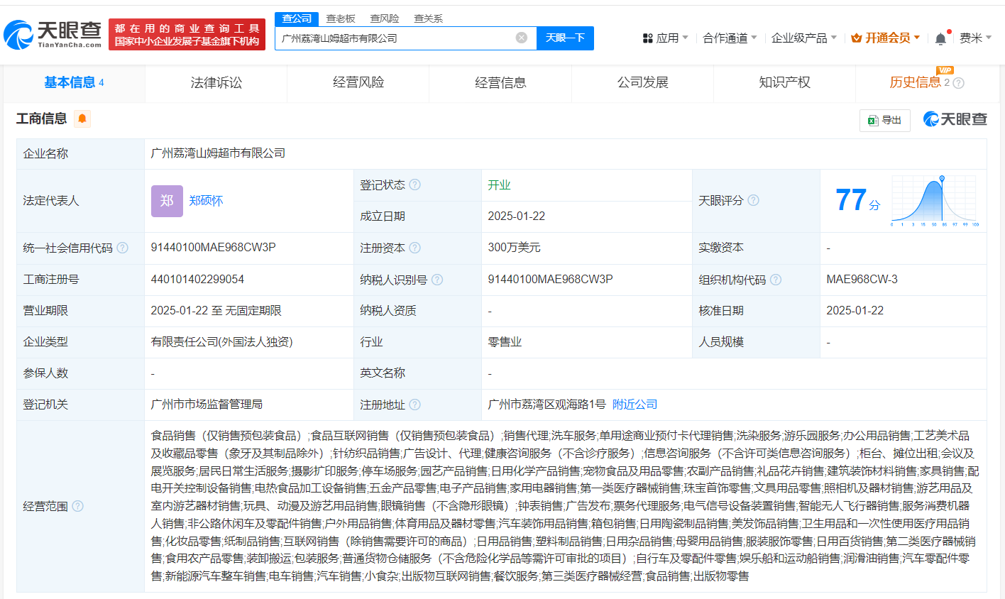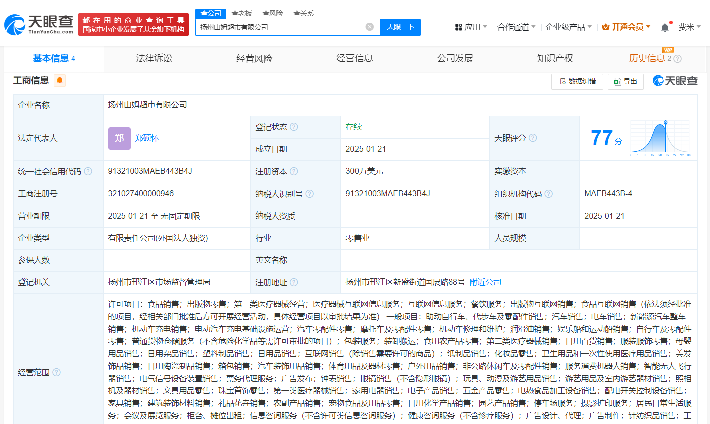 每经AI快讯,据天眼查App最新数据显示,近日,零售巨头山姆会员店在中国市场再度扩张,广州荔湾山姆超市有限公司与扬州山姆超市有限公司相继成立。两家公司的法定代表人均为郑硕怀,注册资本均高达300万美元,业务范围广泛,涵盖了食品销售、出版物零售、第三类医疗器械经营以及餐饮服务等多元化领域。这一布局不仅彰显了山姆超市在中国市场的深耕细作,也进一步提升了其在国内零售行业的竞争力。