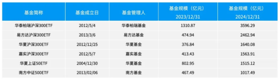 与此同时,千亿级宽基ETF产品不断涌现。截至2024年底,华泰柏瑞沪深300ETF、易方达沪深300ETF等6只ETF的规模超过了千亿元。特别值得一提的是,嘉实沪深300ETF在2024年实现了1150亿元规模的净增长。