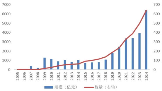 随着市场对指数投资的认识和接受度不断提高,场外指数基金投资逐渐升温。截至2024年底,在境内的832只股票ETF中,有近七成设立了联接基金。ETF联接基金的总数达到639只,规模合计6414亿元,同比增长64%。2024年新成立的ETF联接基金共有164只,新发规模合计达到1044亿元,这一数据是2023年发行规模的6倍。