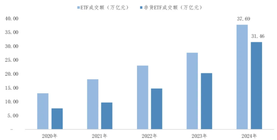 ETF凭借其交易便捷性和投资功能性,赢得了投资者的青睐,ETF的交易活跃度持续提升。2024年,国内ETF总成交额合计达到37.69万亿元,非货币ETF总成交额达到31.46万亿元,分别同比增长36.7%和55.6%。