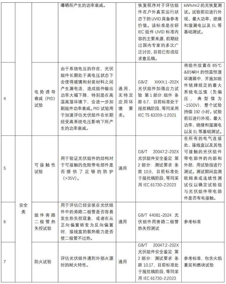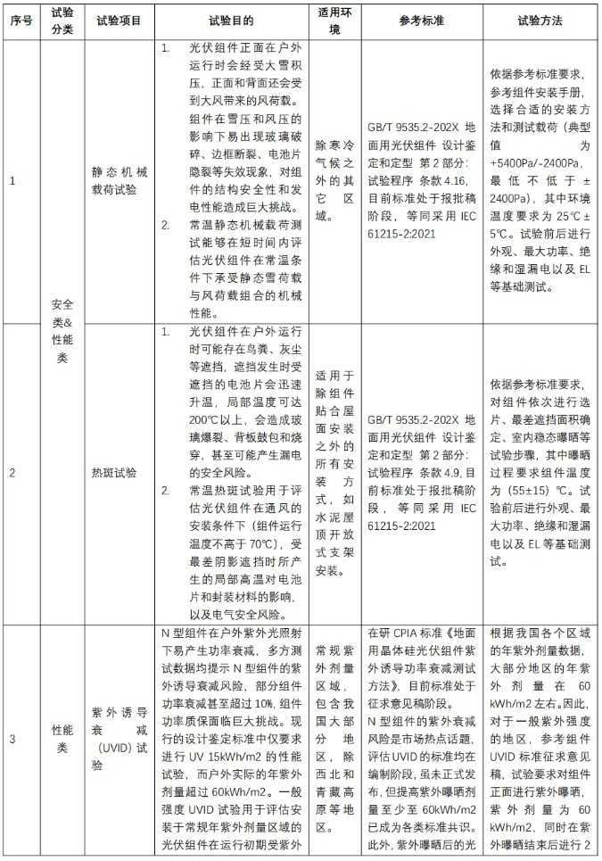 光伏组件的安全性直接关系到光伏电站安装、运维人员的人身安危,而组件的性能则深刻影响着电站的经济收益。在安全类评估方面,将涵盖静态机械载荷试验、热斑试验、可接触性试验、旁路二极管热失控试验和防火试验,这些试验能够全方位评估光伏组件的结构安全性、电气绝缘性能和防火性能。在性能类评估方面,则包括静态机械载荷试验(注:此处与安全类评估重复提及,但为保持原文信息完整性而保留)、热斑试验、紫外诱导衰减(UVID)试验和电势诱导衰减(PID)试验,这些试验将有效检验光伏组件的机械性能、耐热性能、耐紫外衰减和电压应力衰减的能力。具体试验项目及要求已详细列于下表: