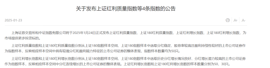 2025年1月23日,上海证券交易所携手中证指数有限公司,联合宣布将于次日即1月24日正式推出上证红利质量指数、上证180红利质量指数、上证红利增长指数以及上证180红利增长指数,此举旨在进一步拓宽市场投资选择,为投资者提供更多元化的投资标的。