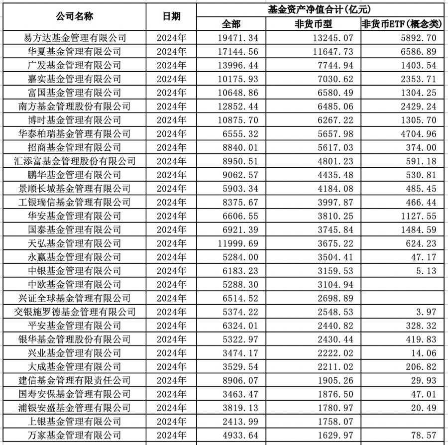 2024年,头部公募基金的综合实力依然强劲。非货规模前十名的公司包括易方达基金、华夏基金、广发基金、嘉实基金、富国基金、南方基金、博时基金、华泰柏瑞基金、招商基金和汇添富基金。其中,易方达基金和华夏基金的非货规模均超过万亿元,继续领跑行业。