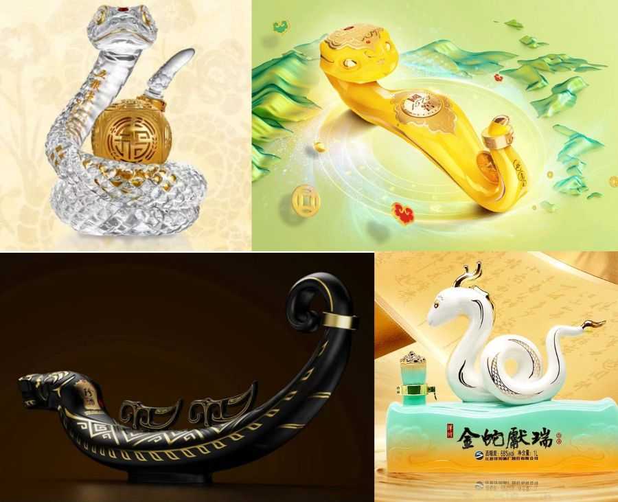 (五粮液、泸州老窖、珍酒、洋河的蛇年生肖酒直接以蛇为造型,来自产品介绍)