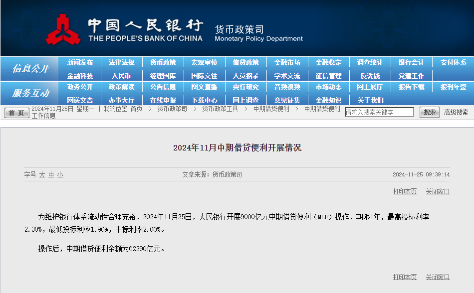 11月25日,中国人民银行(央行)官方网站发布消息称,为稳定市场流动性,央行于当日实施了9000亿元的中期借贷便利(MLF)操作。此次MLF期限为1年,最高投标利率设定为2.30%,最低投标利率为1.90%,而最终中标利率则确定为2.00%。操作完成后,MLF的余额达到了62390亿元的新高度。