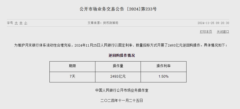 央行于11月25日实施9000亿元MLF操作和2493亿元逆回购操作,中标利率分别为2.00%和1.50%,实现流动性净投放767亿元,旨在稳定市场流动性,促进经济健康发展。