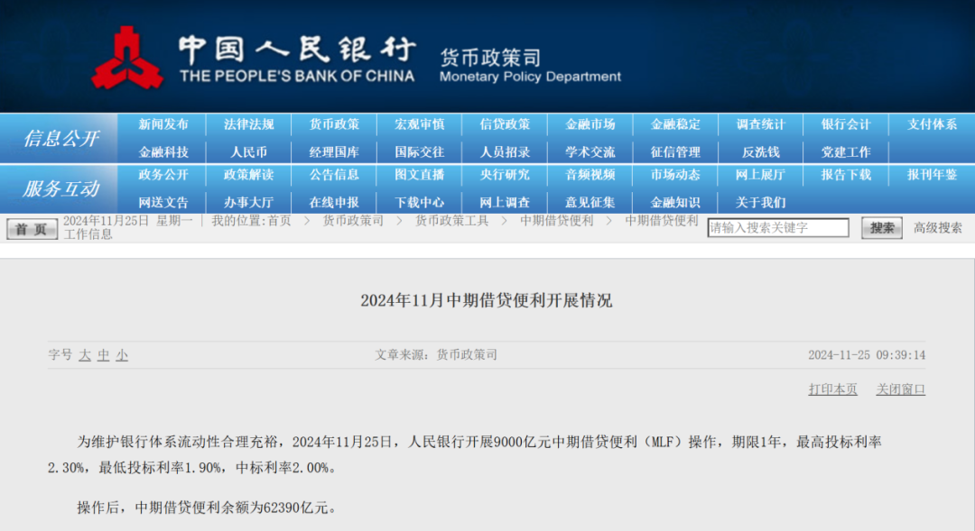 央行最新动态:为维护银行体系流动性合理充裕,央行于11月25日实施了9000亿元中期借贷便利(MLF)操作,期限为1年,最高投标利率2.30%,最低投标利率1.90%,中标利率定格在2.00%。此番操作后,MLF余额达到62390亿元。Wind数据显示,上一次1年期MLF中标利率同样为2.00%,而11月共有14500亿元MLF到期。