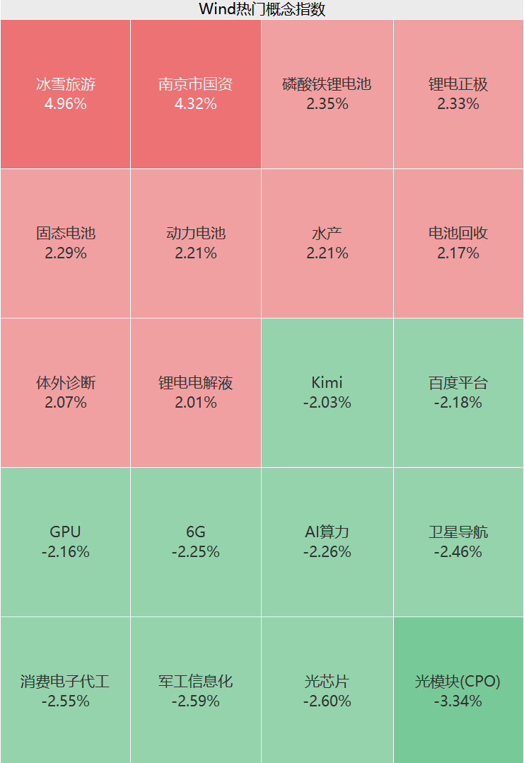盘面热点纷呈,大消费板块表现抢眼,餐饮、旅游、教育等板块走高,南京市国资、冰雪旅游、固态电池等概念股火热。然而,通信、软件、多元金融等行业表现不佳,光模块单边下行,卫星导航、AI算力、6G等概念股也相继走低。