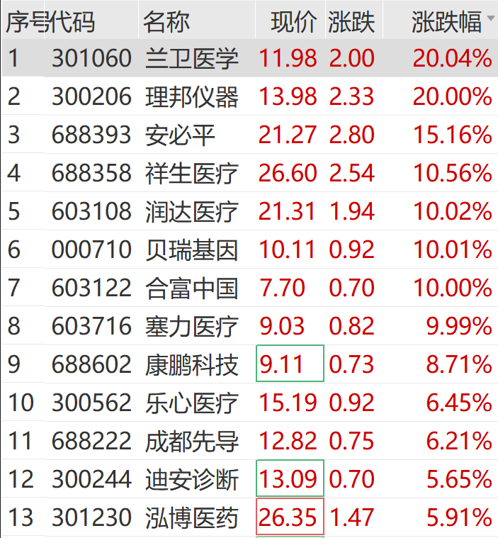 具体来看,智慧医疗板块表现突出,兰卫医学、理邦仪器双双涨停,润达医疗、贝瑞基因、合富中国等多股也涨停。此外,南京国资概念股集体发力,南京商旅、南京化纤一字涨停,南京港封住涨停板,南京公用、金陵药业、南京医药等个股跟涨。