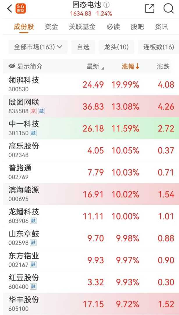 固态电池概念股也表现抢眼,领湃科技涨停,高乐股份、普路通、滨海能源、龙蟠科技等个股也涨停。招商证券研报指出,固态电池在兼顾高能量密度和安全性方面具有显著优势,有望成为未来电池技术的重要发展方向。