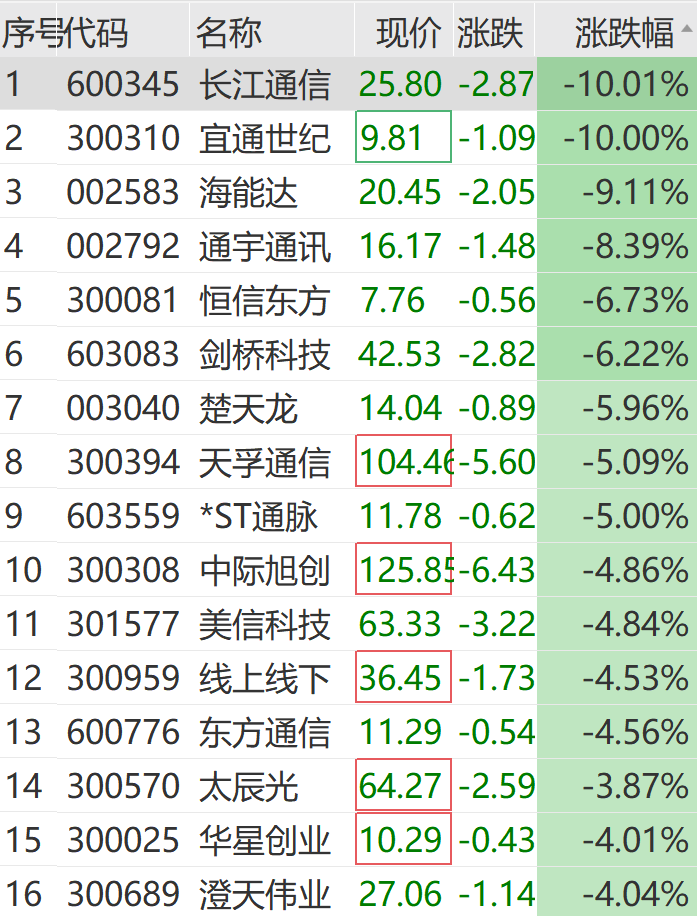 然而,光模块等概念股则表现不佳,长江通信反复触及跌停,环宇通讯、剑桥科技、天孚通信、中际旭创等多股跌幅居前。