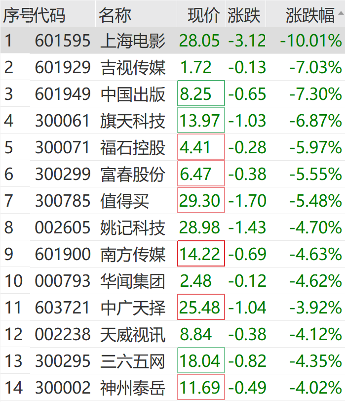 传媒板块也出现回调,上海电影开盘迅速跌停,吉视传媒、中国出版、旗天科技等个股均有明显跌幅。
