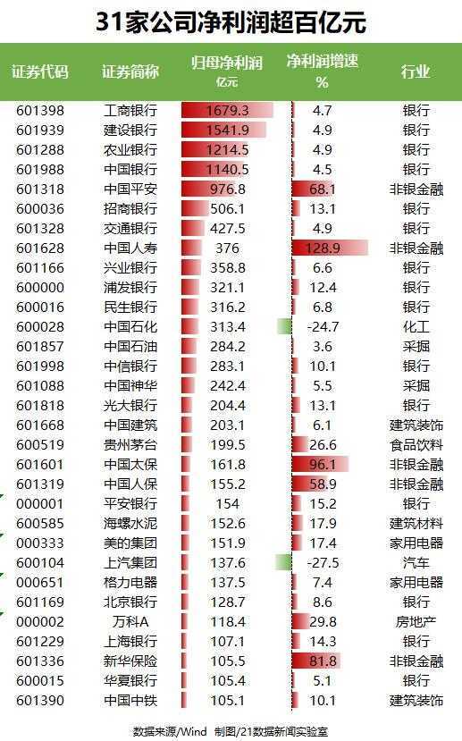 上半年,净利润超过千亿的依然是4家银行,而百亿净利俱乐部成员则实现了历史性突破,从去年同期的26家激增至31家。新上榜的公司包括中国人保(601319.SH)、中国中铁(601390.SH)、上海银行(601229.SH)、万科A(000002.SZ)、中国太保(601601.SH)、新华保险(601336.SH)等6家,而宝钢股份(600019.SH)则因净利润下滑退出该俱乐部。
