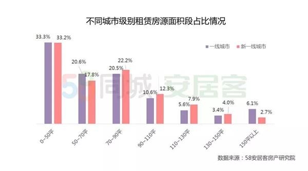 在户型偏好方面,小户型房源更受租房群体欢迎。58安居客房产研究院数据显示,重点19城中,1居室租赁房源占比41.8%,2居室占比33.5%,而4居室及以上大户型租赁房源不足5%。