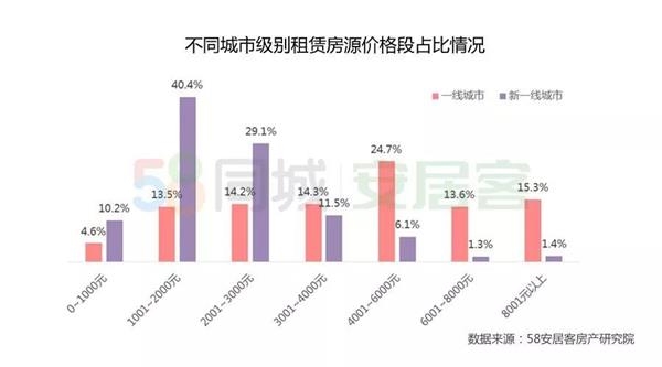 在价格方面,新一线城市1001-2000元/月的租赁房源占比最高,达到40.4%,而一线城市4001-6000元/月的租赁房源占比最高,为24.7%。在新一线城市中,杭州的租金价格最高。
