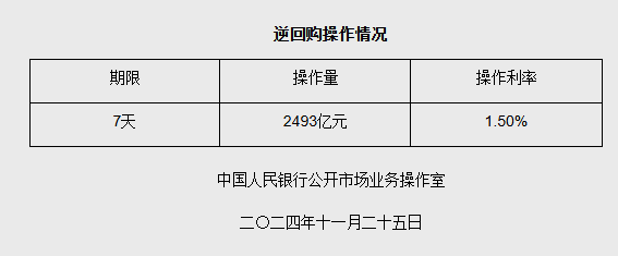11月25日,人民银行以固定利率、数量招标方式开展了2493亿元7天期逆回购操作,中标利率为1.50%,旨在维护月末银行体系流动性合理充裕,确保金融市场平稳运行。