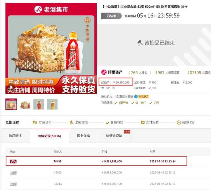 回顾5月16日的拍卖,一瓶“汉帝茅台酒”在阿里拍卖平台上以惊人的99.999999亿元价格成交,这一价格远超市场预期。然而,由于涉嫌恶意竞拍,商家不得不紧急中止了拍卖。据券商中国记者了解,该酒由“中致酒谱老酒馆”拍卖店上架,为1992年汉帝茅台酒53度500毫升,起拍价3999万元。此次竞拍吸引了近10万次围观,1769人报名参与竞拍,最终出价定格在了近百亿元的天价。