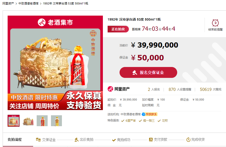 面对这一突发情况,商家迅速采取行动,紧急中止了本场拍卖。5月17日下午,“汉帝茅台酒”在阿里拍卖平台重新上架,此次拍卖的保证金已上调至5万元,并取消了关注店铺即可免缴保证金的条款。截至17日晚上9点56分,虽有2人报名竞拍,但暂未有人出价。