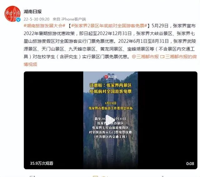 2022年5月29日,张家界市率先行动,宣布了暑期旅游优惠政策,即自当日起至2022年12月31日,张家界大峡谷景区与七星山旅游度假区将对全国游客实行门票全免优惠。此外,在2022年6月1日至8月31日期间,武陵源景区、天门山景区、九天峰恋景区、黄龙洞景区及宝峰湖景区(不含景区内交通工具)将对在校学生(含研究生)实行门票免费政策。
