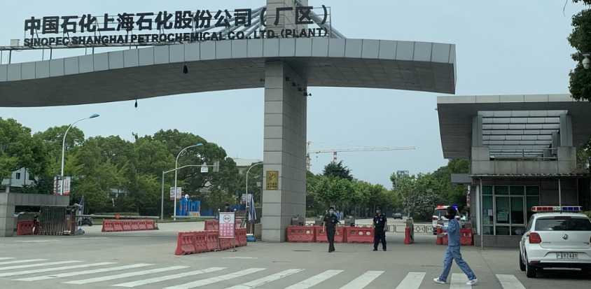 通往上海石化工厂的路上,贴满了纪念建厂50周年的海报,路边堆放着工厂设备。尽管天气炎热,但身着灰色和蓝色工作服的员工仍不断进出工厂。警戒线、警车、保安值守,以及消防器材运输车的驶入,构成了现场紧张而有序的氛围。