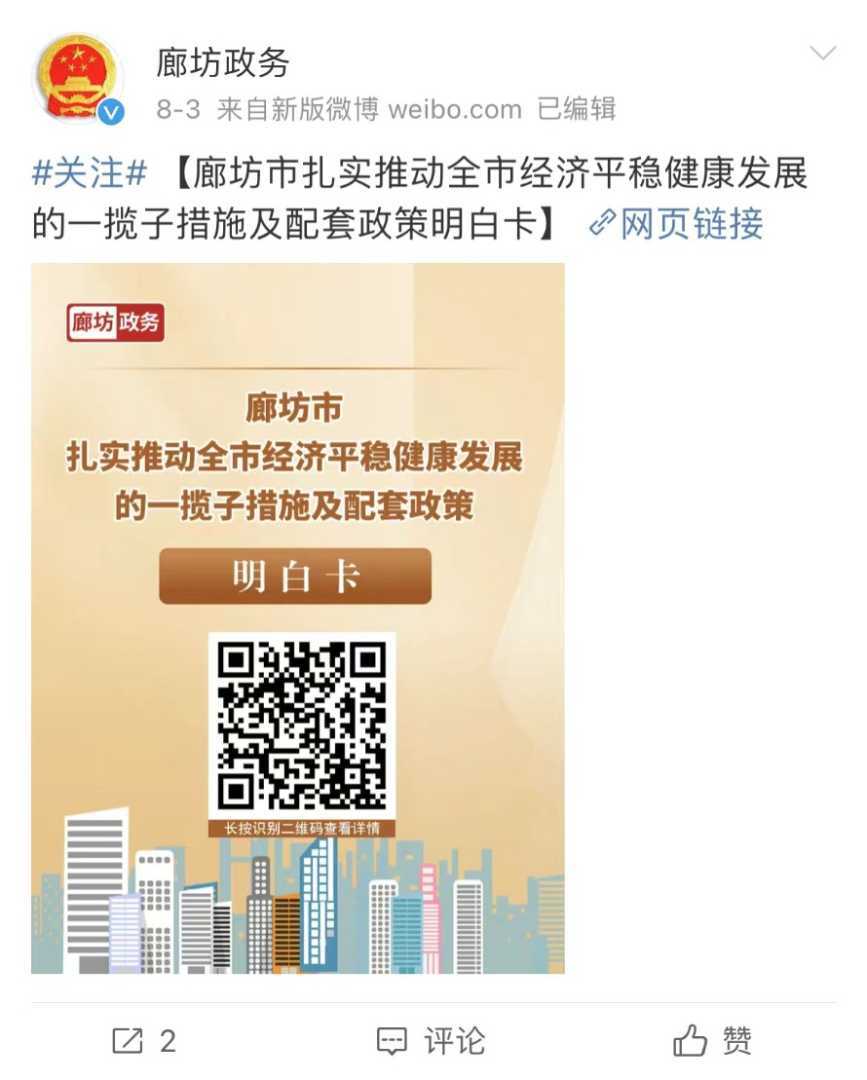 8月3日,“廊坊政务”微博正式发布了相关政策措施明白卡,其中第一条即为优化调整住房限购、限售政策。具体内容涉及取消户籍、社保(个税)等限制性购房资格条件,并对特定人群如高端人才、企业高管及北京非首都功能疏解随迁人员给予本地户籍待遇。同时,“北三县”及环雄安新区周边县(市)等重点区域的非本地户籍家庭,住房限售年限要求也被取消。