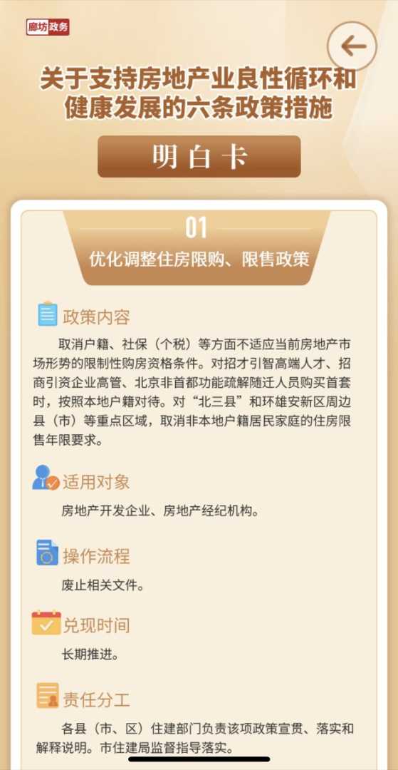 近日,廊坊市政府通过“廊坊政务”微博平台,正式发布了《廊坊市扎实推动全市经济平稳健康发展的一揽子政策措施明白卡》。该政策包中包含了一份针对房地产业的专项措施——《关于支持房地产业良性循环和健康发展的六条政策措施明白卡》。该明白卡明确提出,为顺应当前房地产市场形势,将取消一系列限制性购房资格条件,包括但不限于户籍、社保(个税)等方面要求。尤为引人注目的是,针对“北三县”及环雄安新区周边县(市)等重点区域,非本地户籍家庭的住房限售年限要求也被取消。
