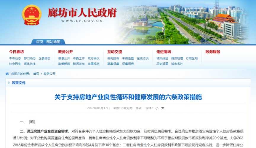 值得注意的是,早在6月17日,廊坊市政府官网曾公布过相关六条政策措施,但当时第一条政策措施内容并未明确。此次发布的政策不仅明确了第一条措施,还详细列出了其他五条措施,包括满足房地产业合理资金需求、保障引进人才合理住房需求、提高房地产交易服务水平、打通安置房与存量商品房通道以及用好绿色建筑金融政策支持等。