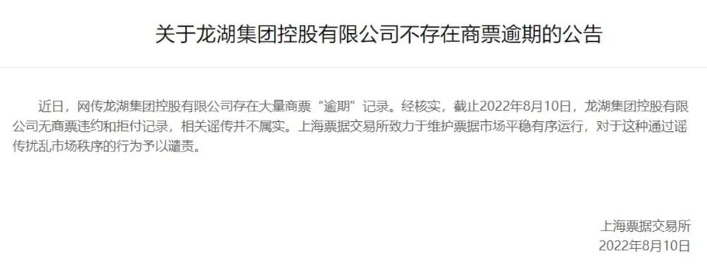 在国内,一家企业因票据逾期传闻而惊动交易所出面澄清的情况并不多见。8月10日晚间,上海票据交易所针对龙湖集团的商票逾期传闻发布了正式公告,经核实确认龙湖集团无商票违约和拒付记录,相关谣传纯属不实信息。此举无疑为龙湖集团提供了有力的背书。