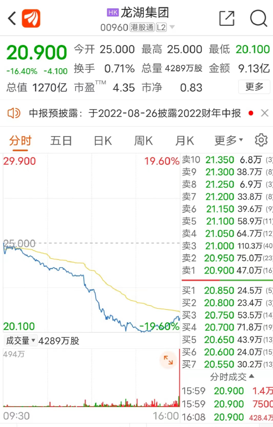 8月10日当天,龙湖集团的股价和债市均遭受重创。港股上市的龙湖集团(00960.HK)股价跌幅一度接近20%,单日蒸发200亿港元市值,创下自2018年11月以来的最低股价。收盘时跌幅仍超过16%,年内跌幅更是超过40%。同时,龙湖相关的债券也进一步下跌,偏离值最高达到30%。