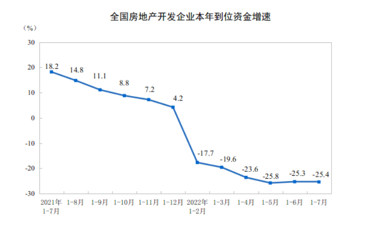 从房企资金状况来看,国家统计局数据显示,今年1至7月,房地产开发企业到位资金为88770亿元,同比下降25.4%。其中,国内贷款为11030亿元,同比下降28.4%;利用外资为53亿元,同比增长20.7%;自筹资金为31495亿元,同比下降11.4%;定金及预收款为28575亿元,同比下降37.1%;个人按揭贷款为14169亿元,同比下降25.2%。