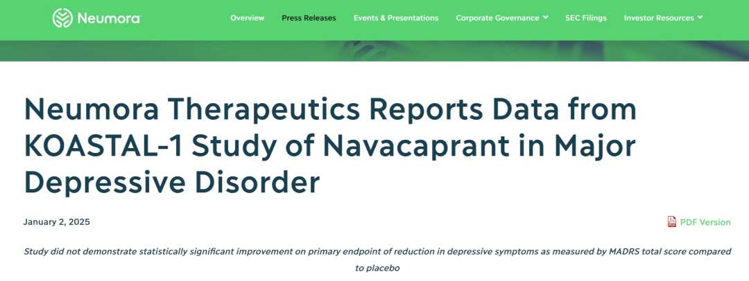 在此之前,navacapant曾被一些分析人士誉为治疗重度抑郁症的最有前景的新方法之一。据统计,美国每年约有2100万人受到抑郁症的困扰。重度抑郁症作为一种严重的精神健康障碍,通常伴随着强烈的负面情绪,对患者的日常生活能力造成极大影响。