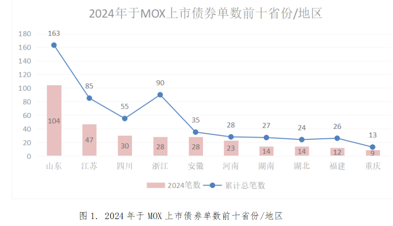 2024年,MOX新增167家发行人,同比增长24.6%。从上市单数看,超九成单数来源于山东、江苏、四川、浙江、安徽、河南、湖南、湖北、福建、重庆、广东11省市的发行主体;从规模看,上市规模前十的来源地同样为这些省份。MOX的发行人“蓄水池”不断扩充,客户忠诚度不断增强。