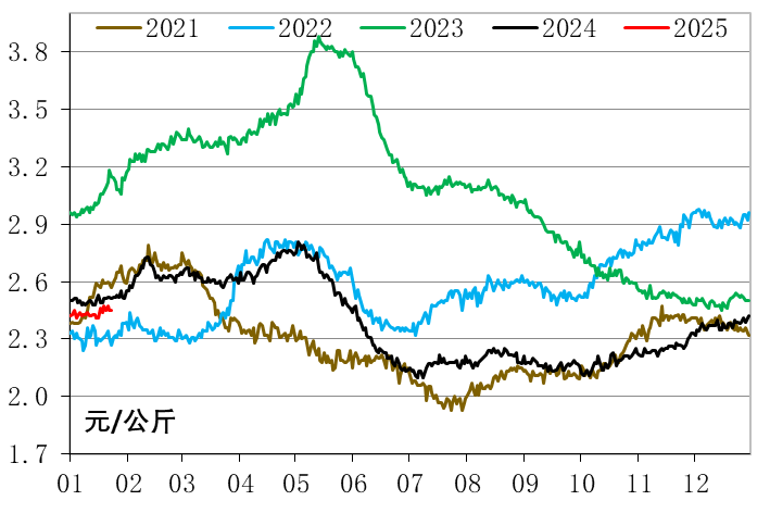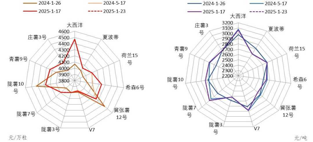 随着春节临近,种植端采购种薯热情减退,导致定西乃至全国种薯出货阶段性停滞。截至2025年1月23日,定西原原种和原种产地批发均价均环比持平,但同比仍呈现上涨态势。预计春节后随着物流成本下降和种薯采购热情复苏,定西乃至全国种薯出货价格有望继续上涨。