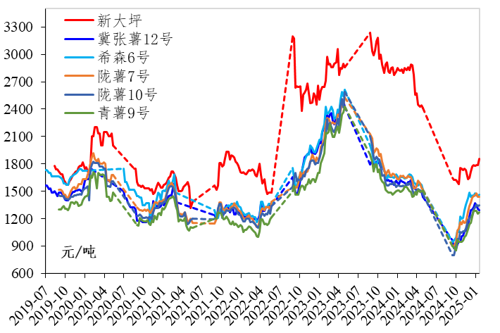 在定西商品薯市场中,除脆质商品薯因市场供给偏多导致价格略有下跌外,其余主销品种出货价均呈现不同程度上涨。特别是优质且品牌化的新大坪品种,领涨市场。具体来看,新大坪产地批发均价为1856.25元/吨,环比上涨3.70%,涨幅居首。预计春节期间及春节后,受终端采购需求下滑和主产区出货速率降低影响,全国商品薯产销两地批发价或将维持窄幅震荡。