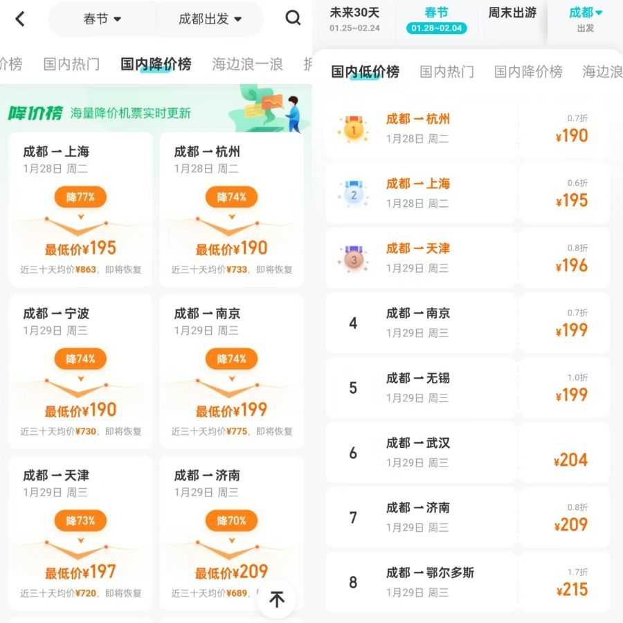 以成都为出发地的机票为例,春节假期期间,成都至上海的机票降价幅度高达77%,至济南降价70%,至杭州降价74%。在低价机票方面,成都飞往杭州、南京、武汉、无锡、天津、上海等城市的机票价格普遍在200元左右徘徊。