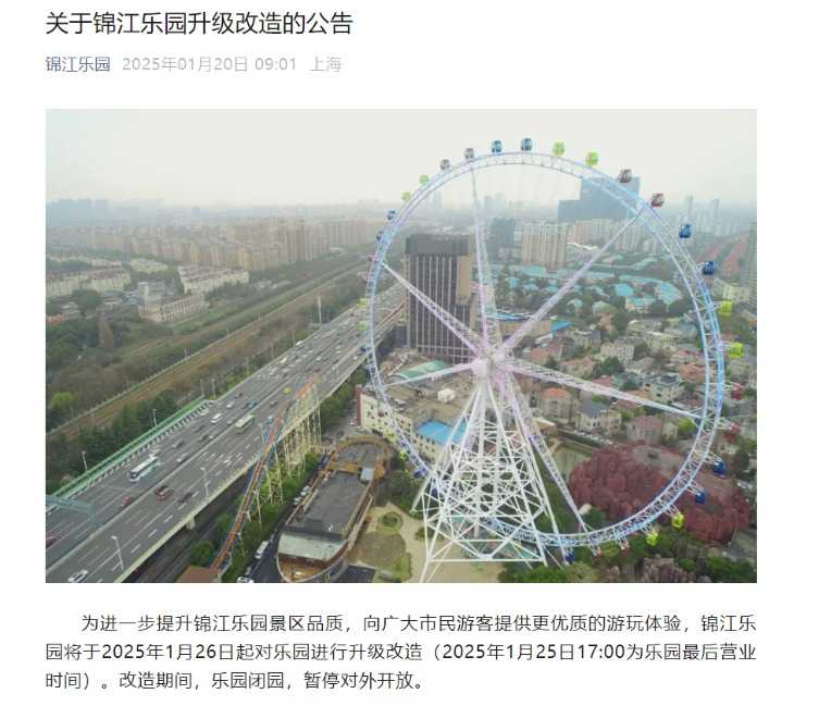 运营逾四十载、承载着无数上海人美好回忆的上海锦江乐园,于2025年1月26日起正式闭园,以迎接全面的升级改造工程。据悉,此次改造预计将于2027年竣工,届时乐园或将焕然一新,并有望引进备受瞩目的哈利波特主题乐园,为游客带来全新的游玩体验。