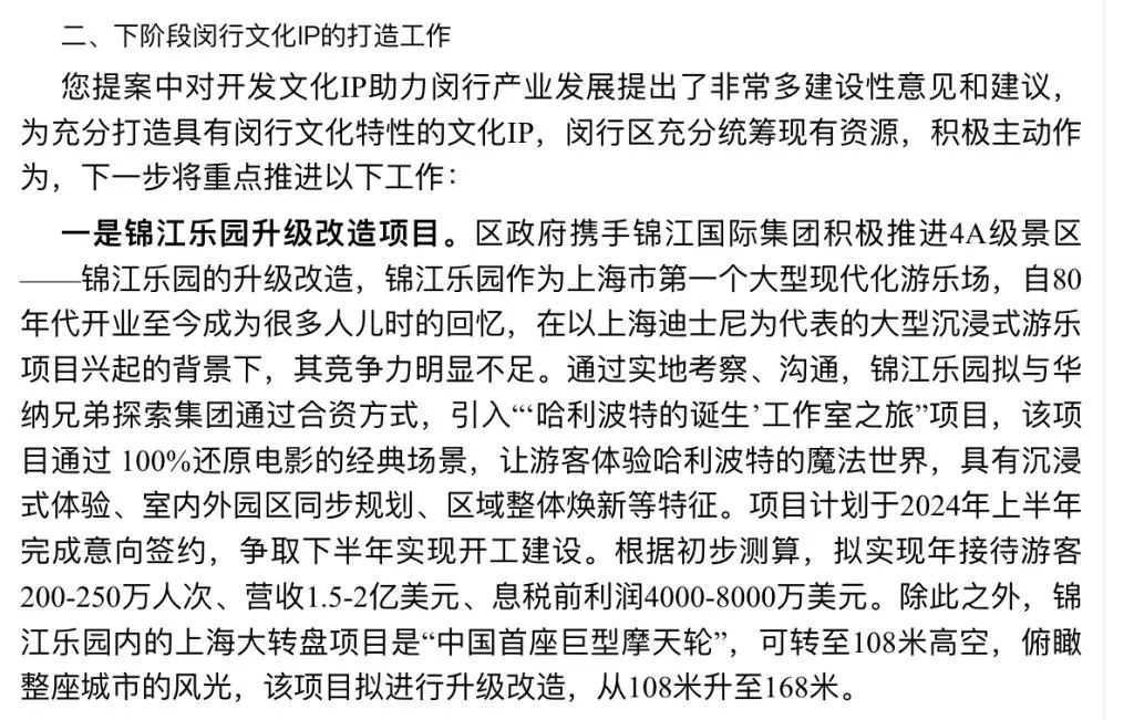 尽管该提案回复目前在闵行区人民政府网站已不可见,但上海锦江乐园的保安对于哈利波特主题乐园的引入给予了肯定的答复。