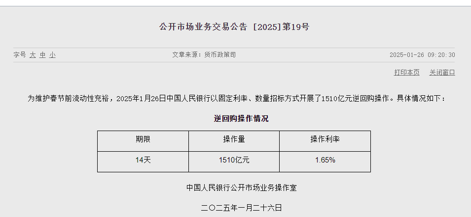 2025年1月26日,中国人民银行为维护春节前金融市场流动性充裕,成功开展了1510亿元14天期逆回购操作,操作利率为1.65%,此举旨在稳定市场预期,确保节日期间金融市场平稳运行。