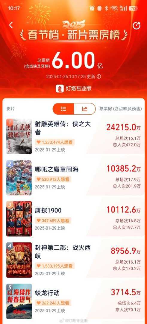 据灯塔专业版数据统计,截至2025年1月26日,正值新春佳节前夕,2025年春节档期上映的新片预售总票房已经强势突破6亿元人民币大关,显示出观众对于新春电影市场的热烈期待与高度关注。