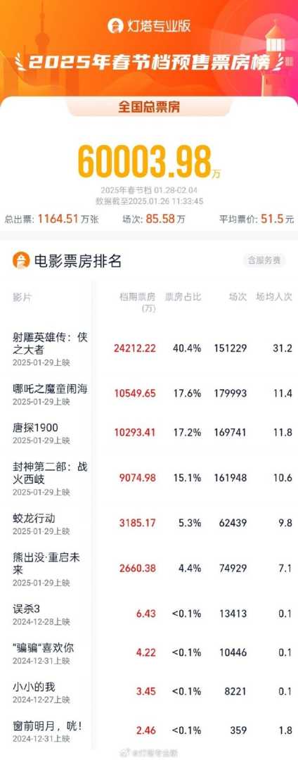 截至2025年1月26日11时33分,2025年春节档档期总预售票房已突破6亿元,刷新中国影史春节档预售最快破6亿纪录,预示着今年春节档有望迎来观影热潮。