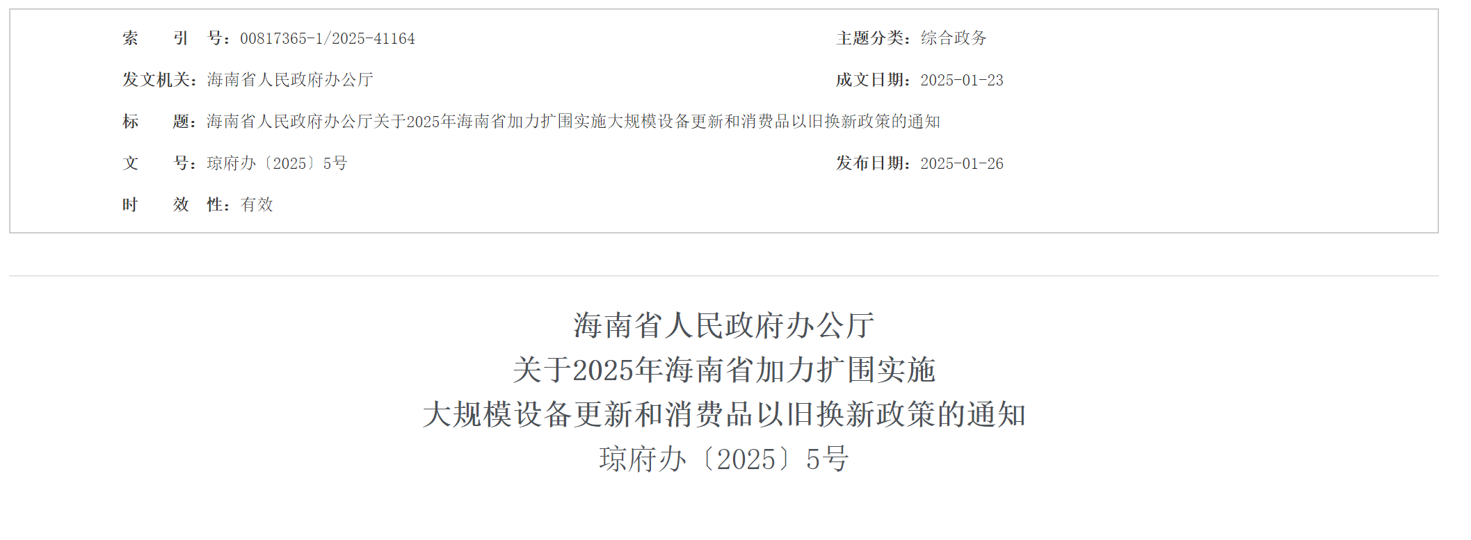 海南省人民政府办公厅发布2025年加力扩围实施大规模设备更新和消费品以旧换新政策通知,扩大汽车报废更新支持范围,全面落实国家汽车以旧换新政策,并加大对家电产品以旧换新的支持力度。