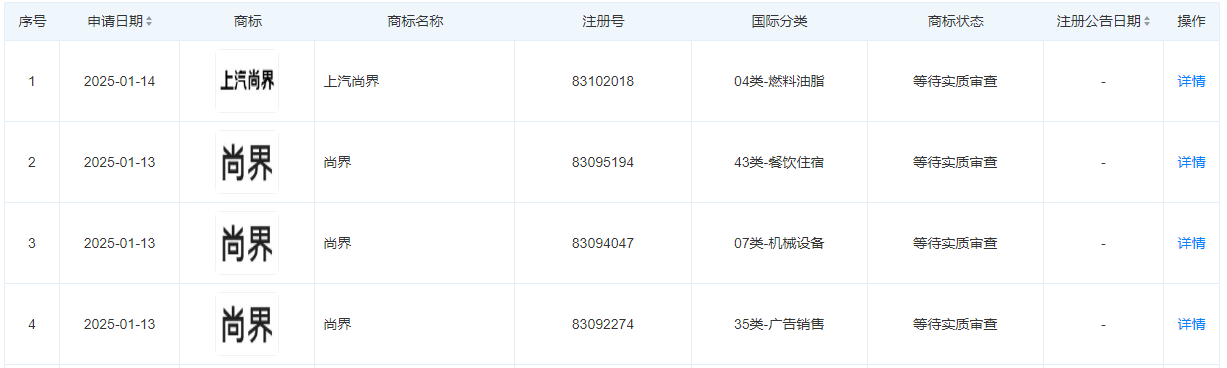 据天眼查数据显示,自1月13日至1月14日,上海汽车集团股份有限公司密集提交了包括“尚界”、“上汽尚界”在内的多枚商标申请,这些商标的国际分类广泛涵盖了机械设备、广告销售等多个领域,目前所有申请均处于等待实质审查的阶段。这一连串的商标申请动作,无疑预示着上汽集团未来可能在这些领域有所布局或创新。